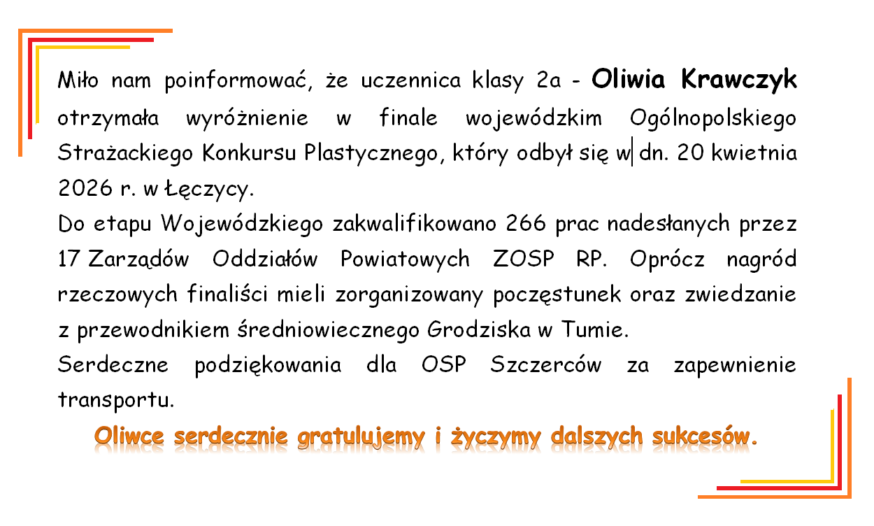 Wykonaliście fantastyczną pracę i osiągając tak wysokie wyniki,możecie być wzorem dla innych uczniów. Jesteśmy dumni z Waszej pasji i ciężkiej pracy.